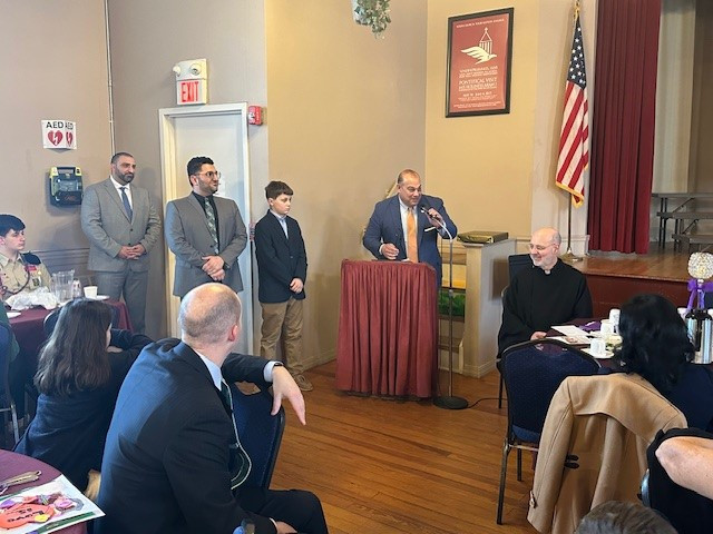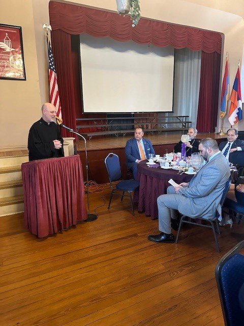 Following Badarak, a celebratory banquet for Vartanantz Day was held in Aramian Auditorium. Welcoming remarks were provided by Board chairman Levon Attarian, who also served as emcee for the afternoon. Keeping in line with His Holiness, Vehapar Aram I, proclaiming 2024 as “The Year of Human Resources Preparation”, Der Kapriel and the Board of Trustees selected Raffi Rachdouni as the honoree for this year. Raffi has been involved in church life since a very young age. Raffi plays a vital role at our summer Bible Camp, he is the music instructor for our Armenian School, and he is the musical instructor for the Eastern Prelacy’s Siamanto Program. Raffi is also the co-creator of the Mourad Armenian School Dzapeeg-Tateeg program. He touches the lives of the youth of our community and the Prelacy, ranging from infants to high school students. He is also involved in multiple affiliated organizations. He is married to Bethany (Sousa) Rachdouni and is a proud father of three sons, Marcos, Tomas, and Rafael. Raffi received the Vartanantz award along with a gift from Der Hayr and the Board of Trustees. He was then joined by Matthew Burke and both received certificates from Srpazan Anoushavan along with his kind words. Both were also given citations by the Honorable Senator David Tikoian after he provided brief remarks. Raffi then took the podium and expressed his appreciation for receiving this honor and thanked all those involved in making this a memorable afternoon for him.