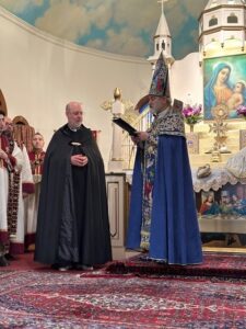 Then, a surprise presentation was made by His Eminence in honor of the 10-year anniversary of Rev. Fr. Kapriel Nazarian’s ordination. Archbishop Tanielian praised Fr. Kapriel and Yeretzgeen Debbie for shepherding their parish with faith, hope, and love. In honor of this occasion, at the request of His Eminence and the blessing of His Holiness Catholicos Aram I, Fr. Kapriel was bestowed a floral pilon (liturgical vestment) to be worn on feast days and other special occasions.