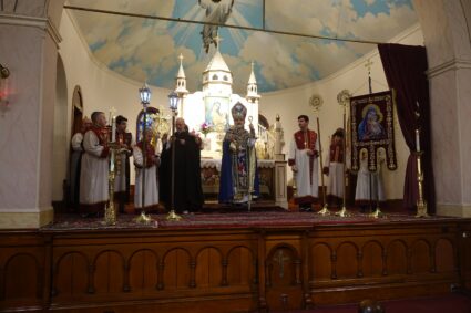 Nearing the end of the service, His Eminence offered a special blessing of a processional flag, donated by the Tikoian family, kshotz (liturgical fans) donated by the Khatchadourian family, and new lanterns donated by the Nalbandian family. Archbishop Tanielian explained that it is a tradition in the church to bless any new item that is going to be used on the altar.